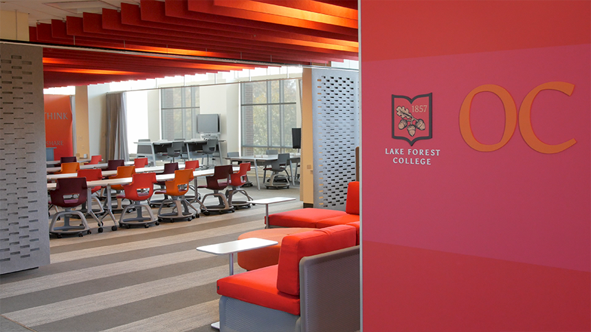 Then, Rampolla, Thomas, and Adam Cortright, Facilities Management Associate Director, brought in Forward Space to assist with furniture selection and specification, and Valenti Builders to construct the space. “The Oppenheimer Center is a refreshing update for the College,” Cortright said. “The colors are vibrant! The furniture and space are flexible enough to accommodate many different functions of teaching and events. I thoroughly enjoyed working on this project with Trish (Thomas), Kate (Jackson) and their team of students and contractors for this much needed space on campus.”