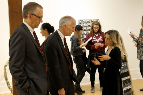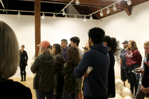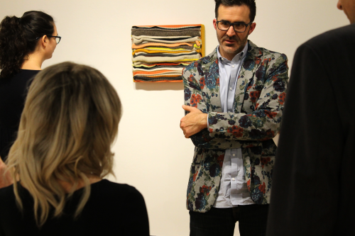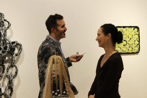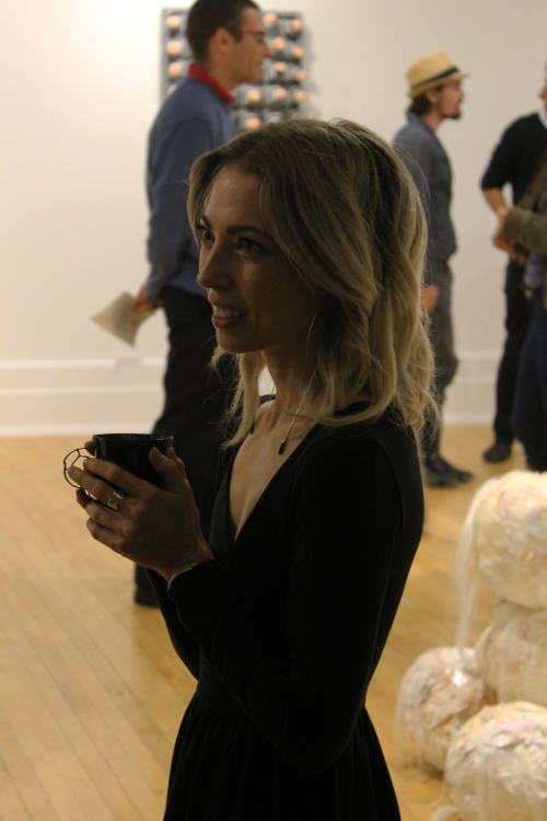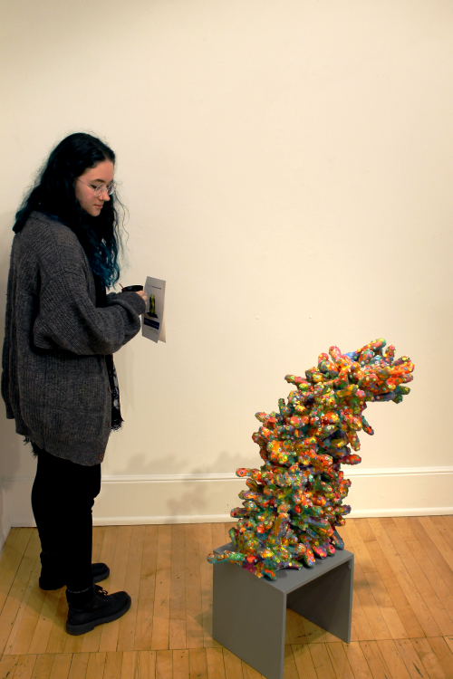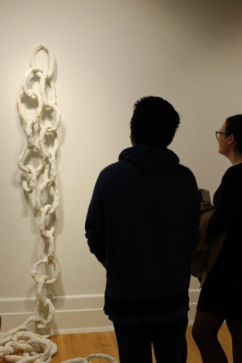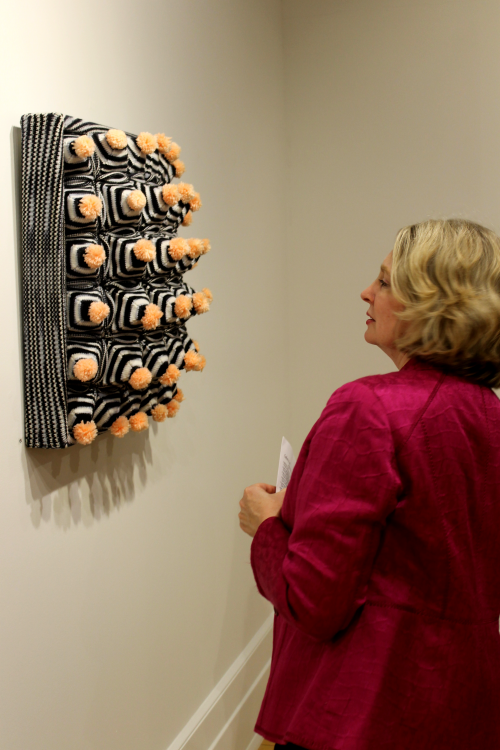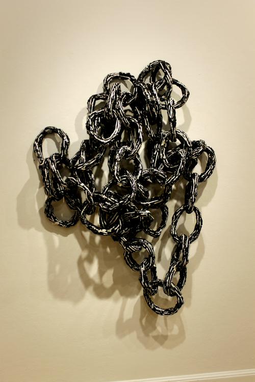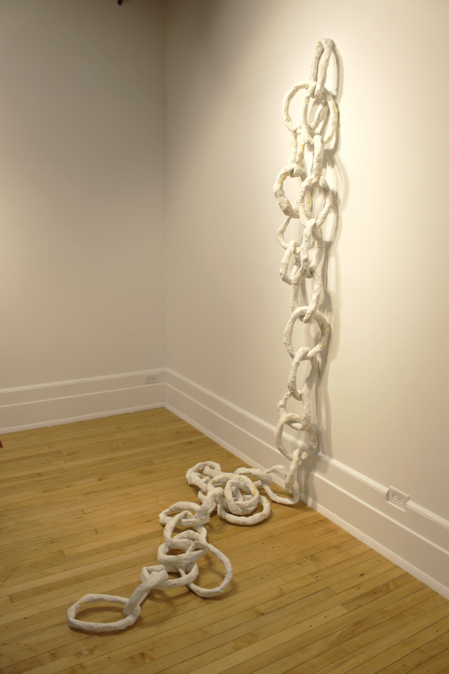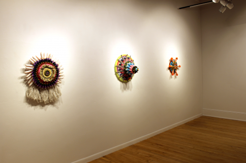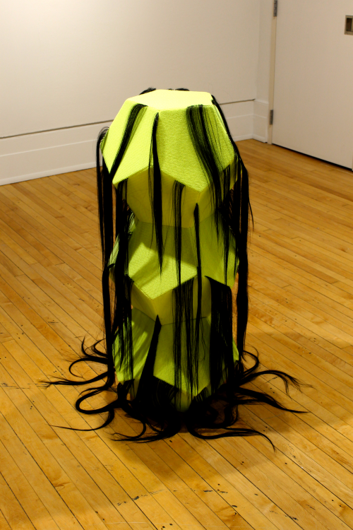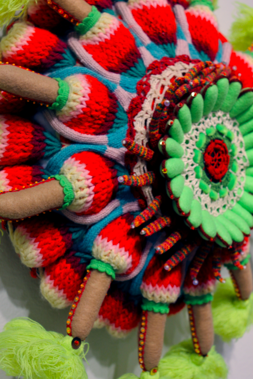 Sam Jaffe is a multi-disciplinary artist currently living and working in Chicago. The works in this exhibit combine textiles, papier-mache, wood, yarn, jewels and household objects. In her artist’s statement, Jaffe explains her work as a discussion of the relationship between automated mass-production and slow, painstaking processes that involve an individual’s hand.