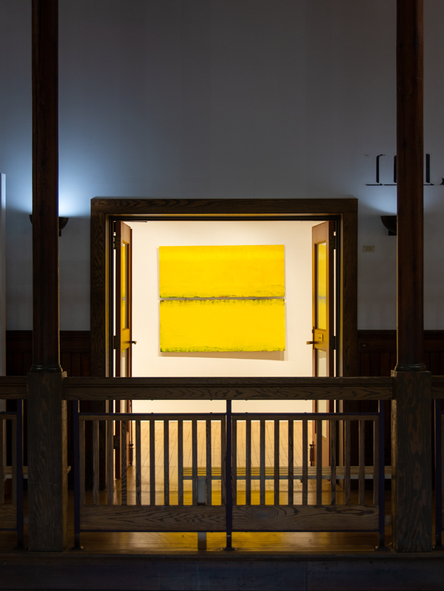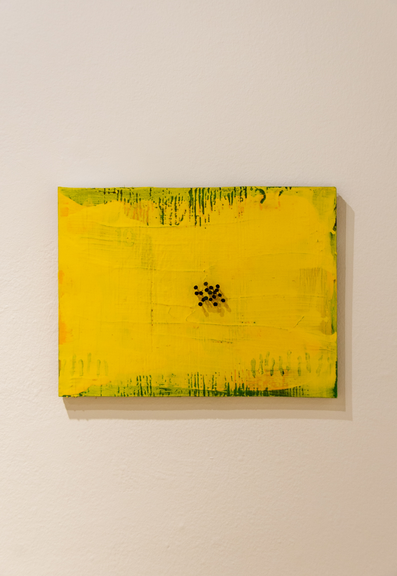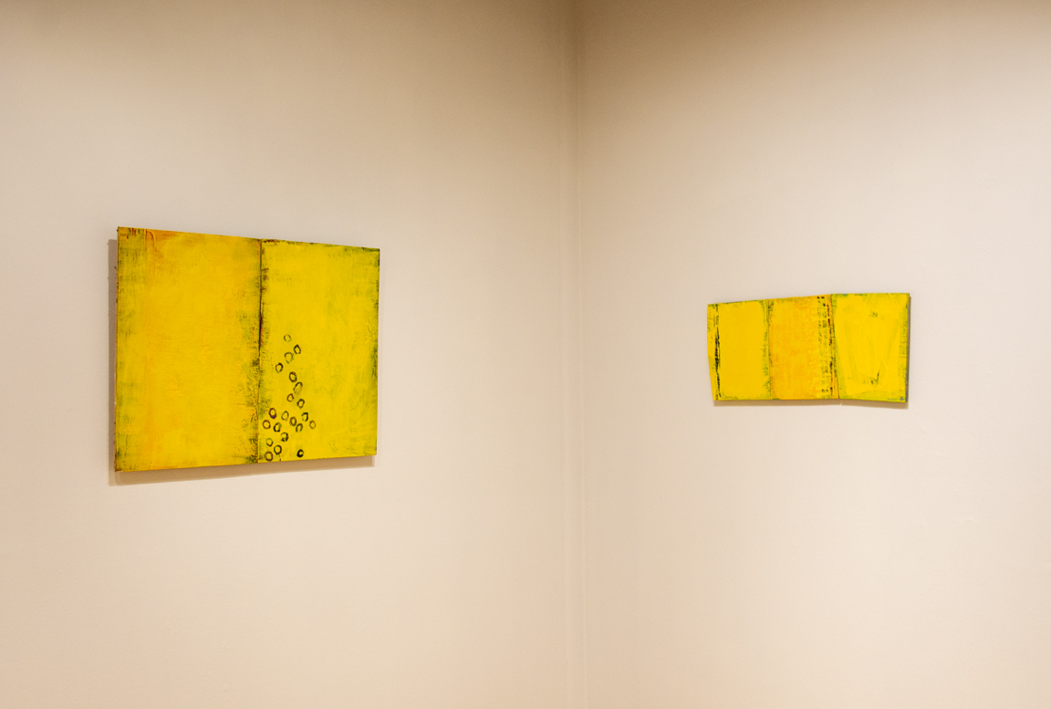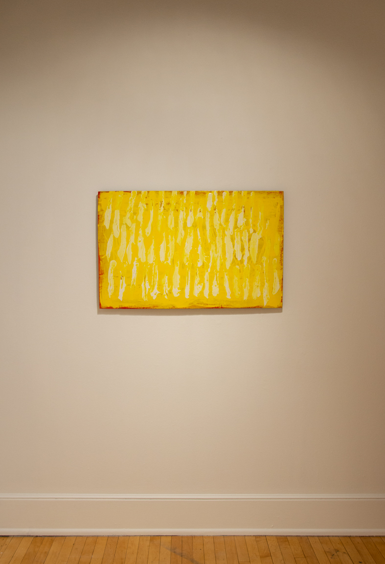 Into Sunrise is an exhibit of acrylic paintings. Saturations of yellow seem like an allowance of positivity, and like walking through prairies full of summer flowers humming with insects in the breeze. These works layer textures and colors over each other until a surface of bright, warm yellow is created to represent clarity, happiness and light, built on layers of deep experience.