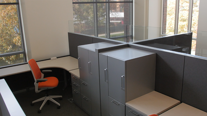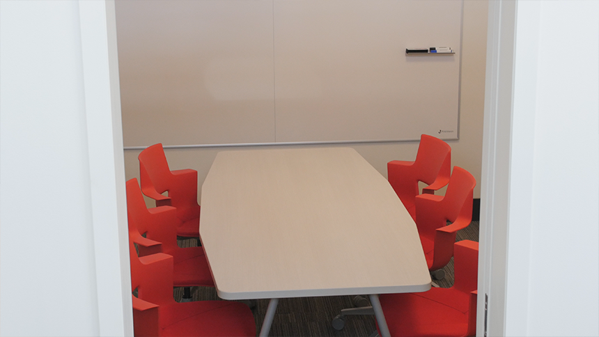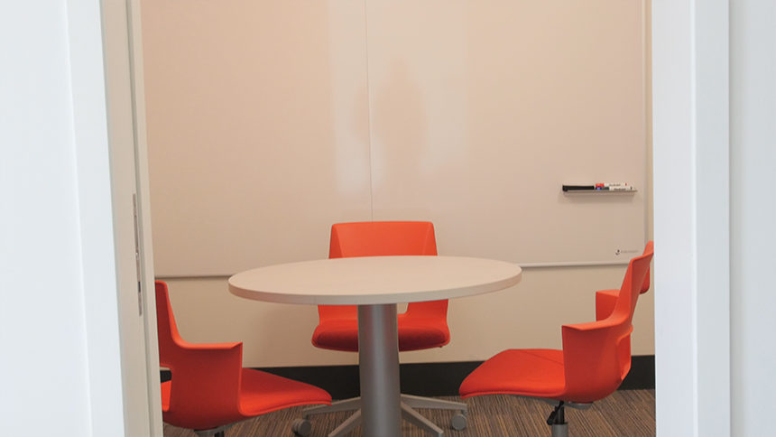 In Fall 2019, students in Thomas’ Entrepreneurial and Social Ventures I: Product Market Fit class used the ENTP curriculum to develop the programming requirements for the space which included shared workspaces, a classroom that can convert to a public presentation space, video conferencing screens, designated workspaces for students pursuing real-world ventures, and a great deal of sound-absorbing material. Based on the student research, Mary Beth Rampolla, Founder and President of Viro Design Lab, brought the students' vision and research to life in her design for the OC.
