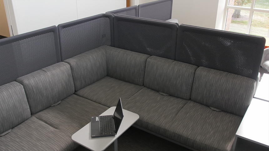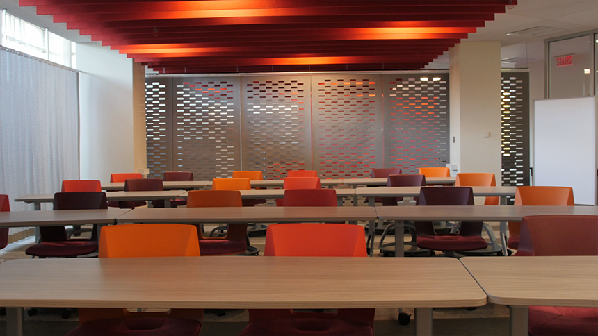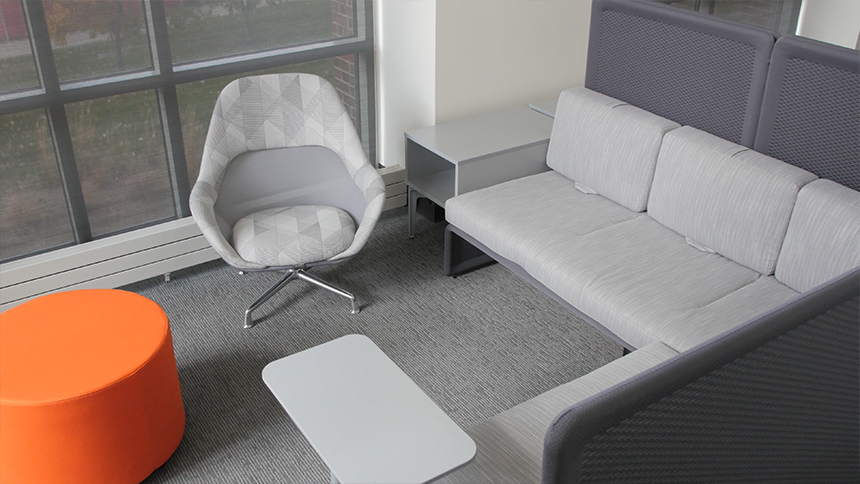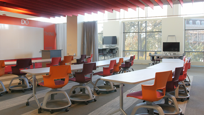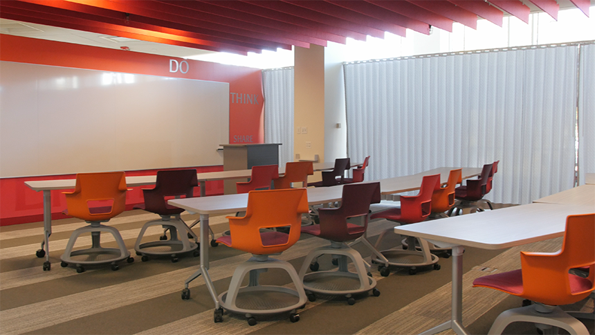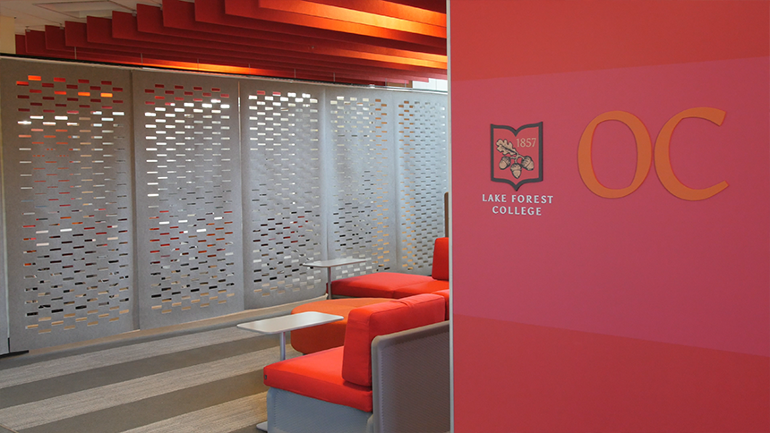 Then, Rampolla, Thomas, and Adam Cortright, Facilities Management Associate Director, brought in Forward Space to assist with furniture selection and specification, and Valenti Builders to construct the space. “The Oppenheimer Center is a refreshing update for the College,” Cortright said. “The colors are vibrant! The furniture and space are flexible enough to accommodate many different functions of teaching and events. I thoroughly enjoyed working on this project with Trish (Thomas), Kate (Jackson) and their team of students and contractors for this much needed space on campus.”