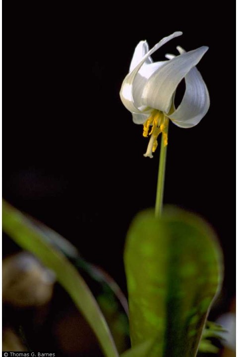 The White Trout Lily grows in large colonies that can cover a large amount of a forest floor in the early period of Spring. Most of the plants have a single leaf, however when mature they gain a second basal leaf with a flower growing from the top of a long stem. The blooming of the flower is charming; it blooms in a shy nodding position encouraging one to appreciate the beauty inside by tipping it back slightly.