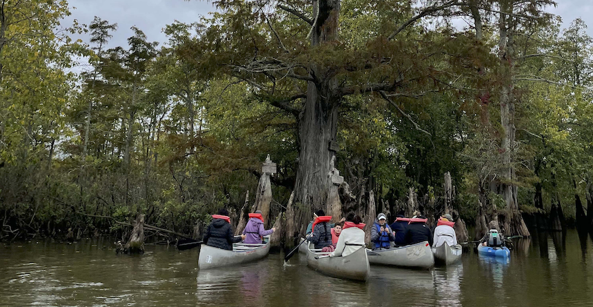 ES282: Lake Forestry students canoeing Heron Pond in Southern Illinois to learn about the Bald Cypress trees