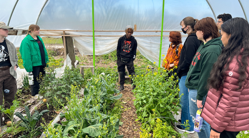 Students touring Sweet Water Foundation's hoop houses for ES323: Black Environmental Culture