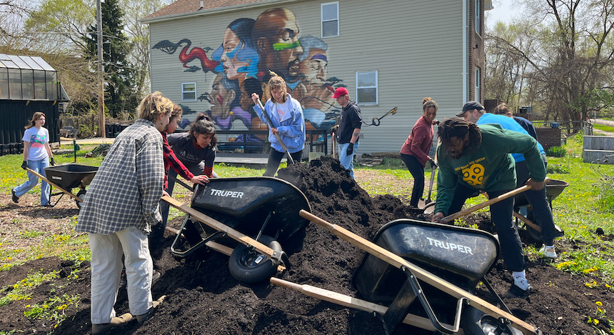 ES323: Black Environmental Culture students moving soil to raised garden beds at Sweet Water Foundation