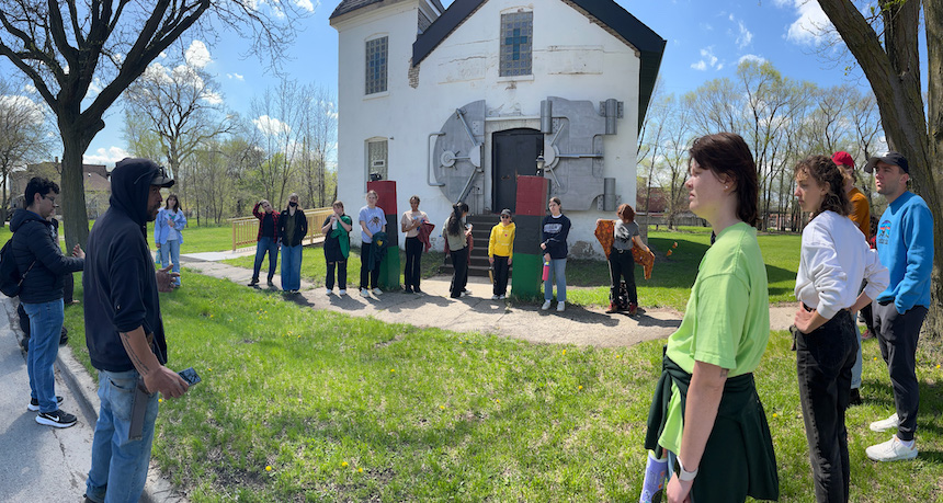 ES323: Black Environmental Culture students learning about the art installation at the Sweet Water Foundation