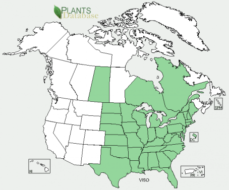 The common blue violet has a large distribution in across eastern North America. This map from the United States Department of Agriculture website shows the wildflower’s range in green.
