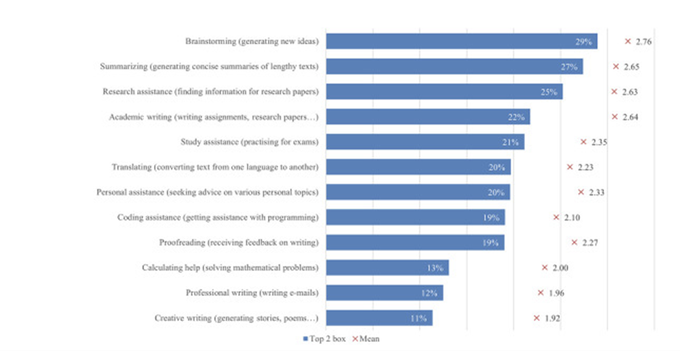 Figure 2. A survey of common academic uses for AI reported by undergraduate students. While tasks such as brainstorming and summarizing are prevalent, the use of AI to complete assignments and generate texts raises significant academic integrity concerns (Ravšelj et al. 2025).