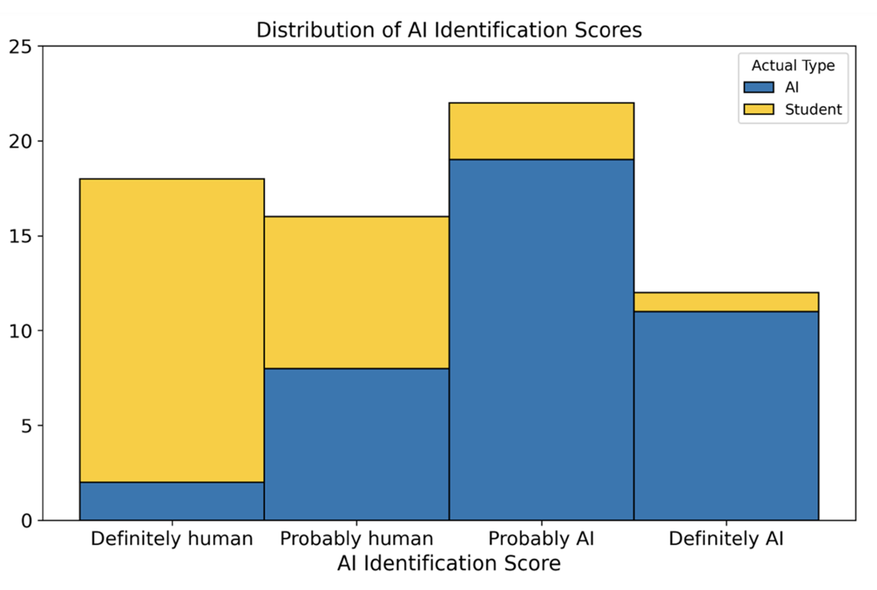 Figure 3. High Rate of Misclassification of Student Work by AI Detection Software. Graph shows how a detector scored known student and AI-generated texts. A significant portion of authentic work (yellow) was incorrectly flagged as “Probably AI” or “Definitely AI”, highlighting the unreliability of these tools (Revel et al. 2024).