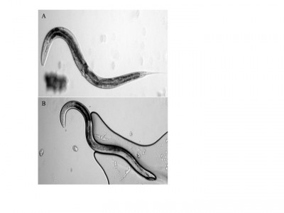 Figure 2: (A) Adult hermaphrodite and (B) adult male with an arrowhead tail at 100x magnification (bright field): (A) Adult hermaphrodite and (B) adult male with an arrowhead tail at 100x magnification (bright field).