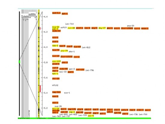 Complementation analysis and further SNP mapping data of M77 mutants mapped the genetic defect to a region between -2.78 and -4.7 mapping unit (mu) on chromosome III, contrary to the previously reported M77 data. My colleague Andrew Ferrier suggested that the M77 mutant allele mapped close to the mor-1 gene, which also exhibits blunt phenotype; however, the recent data supports the mor-1 gene mapping outside this mu range. Still, there are many larval lethal genes that have been identified but not yet described between map units -2.78 and -4.7.