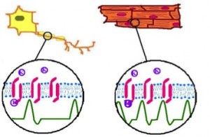Figure 1: Increased KATP channel current and relatively low frequency of action potentials fired in Purkinje nerve cells (left) compared to muscle cells (right). When exposed to a KATP channel inhibitor, the frequency of action potentials was similar to muscle cells, demonstrating that motor impairment in patients with iDEND originates in nerve cells.
