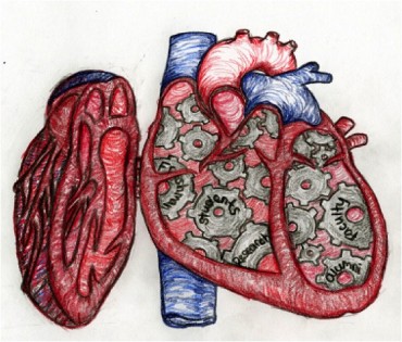 “The thought behind my design came from the theme of “parts of a whole.” When, without all of the pieces, you do not have a functioning machine; you must have every part to get the gears in motion. In Eukaryon we are all inter-dependent and it allows for a productive and highly efficient piece of work. It does not matter how small your role in Eukaryon is. Without the smallest participants, a machine cannot run and a heart cannot function. I personally think that Eukaryon is at the heart of the science department and that we are just one part of the all-encompassing body of Lake Forest College. We are all merely parts of the whole.”