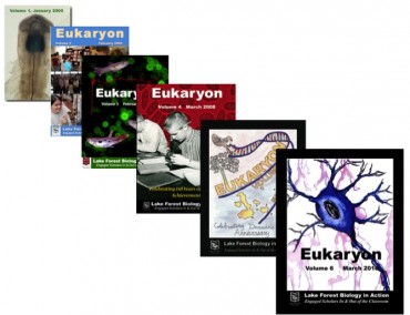 Every year Eukaryon accepts artwork from enthusiastic and talented Lake Forest students for the cover page of its annual journal publication. Over the years, the cover has evolved greatly. The first issue did not have a theme and instead illustrated a photograph of a chick embryo taken during a developmental biology lab. As the journal matured, the following year had a theme. The theme was biology students in action” and it was demonstrated in the form of a collage of pictures of the various activities biology majors are involved in. The 3rd edition highlighted the undergraduate research at our college by showcasing artistically integrated experimental data and the organisms from the issue’s primary articles and senior thesis. The 4th edition of the journal coincided with an important anniversary for the college–it was a tribute to 150 years of science teaching at LFC. The subsequent year was followed by another important date: 150th anniversary of Darwin’s book “On the Origin of Species by Means of Natural Selection.” The cover page of the 5th edition of the journal was a tribute to Darwin’s book due to its enormous impact on the course of the development of biology. The theme of the 6th edition was “evolving connections” and the cover highlighted one of the important additions to the science department, the neuroscience major and the biochemistry and molecular biology major.