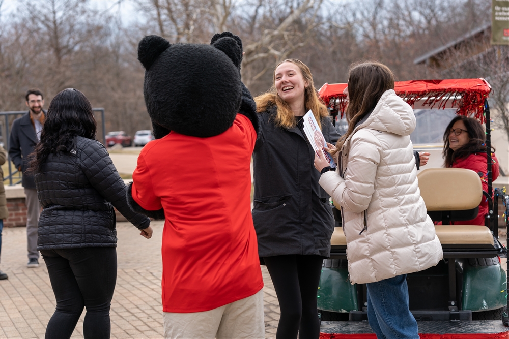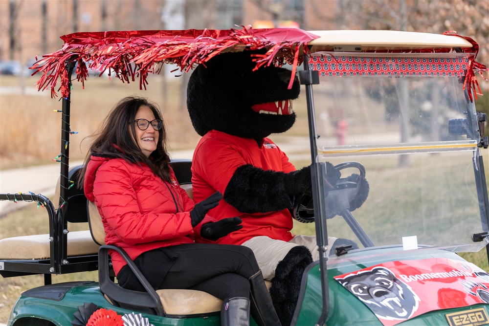 The fun-filled day kicked off in the morning with President Jill Baren and Boomer circling Middle Campus in a Forester-decorated Boomer Mobile to ask students trivia questions about the College for a chance to win donations in their name.