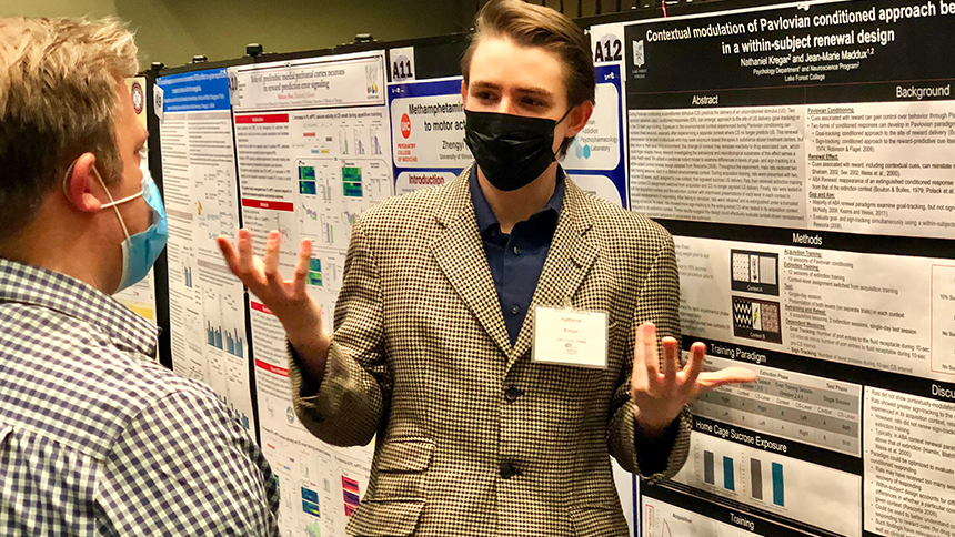 Biology and neuroscience senior Nathaniel Kregar ’22 received third prize among undergraduates for his senior thesis poster presentation. Kregar’s thesis is based on his research in Assistant Professor of Psychology and Neuroscience Jean-Marie Maddux’s lab, where h first started working as a Richter Scholar the summer after his freshman year. That lab research has turned into a career focus for Kregar, who is applying for PhD programs.