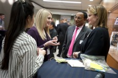 Zoe Maurer '17 (from left) and Lara Winkler '16 network with Greg Evans '75 and Courtney Wright
