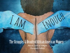 Join us in the Deerpath Student Art Gallery on Saturday, March 23 from 4 to 5:30 p.m. for the I Am Enough art exhibit opening by Imani Davis ’19. The work will also be displayed on March 25 and 26 from 7 to 10 p.m.