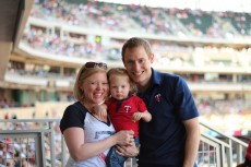 Andrea Stoermer '05, husband Erich, and daughter Paige enjoy the game.