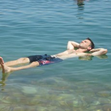 Paulius Kuprys ’12 floats in the Dead Sea during his summer trip to Israel. He spent a month there to work with a gene e...
