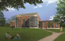 The Class of 2017 chemistry majors and faculty gathered for a photo at the rock uncovered in 1961 when the Johnson Science Center was built and in front of the Lillard Science Center, which is currently under construction.