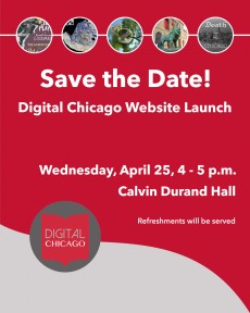 In addition to hors d’oeuvres, our launch celebration will feature a brief toast celebrating the launch of the site as well as several laptop stations where guests can browse the website. The Digital Chicago grant staff—Project Director Davis Schneiderman, Chicago Digital Humanities Coordinator Emily Mace, and Digital Archivist Anne Thomason—hope you and any interested students or community members will be available to join in the celebration.