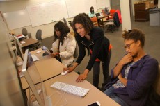 Editors Jordyn Albert (from left), Camille LeMieux, and Kendall Tyson collaborate on a late-night newsroom decision.