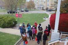 Prospective students and their families toured campus during a light snowfall on November 10.