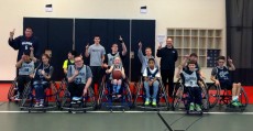 Great Lakes Adaptive Sports Association's wheelchair basketball team members celebrate after their Community Day performance.
