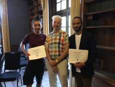 Two of the inaugural Roger White Scholarship winners in Philosophy–Christian Aldana ’19 and Corey Beckford ’19–pose with Mr. White at the reception where they received their prizes. A good time was had by all. 9/21/17