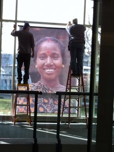 Facilities Management staff install huge photographs around campus for Islamic World Studies’ week-long program, Portrai...