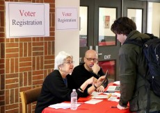 Carol Gayle and Jim Marquardt are registering voters during lunch this week. Registration closes February 16.