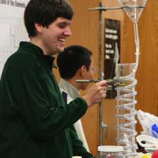 Tom Pospiech ’14 demonstrated the chemiluminescence of luminol in a “disco show” and Huy Hoang ’14 ignited methanol canons in the hallway. All demonstrations impressed upon the high school students how cool chemistry can be.